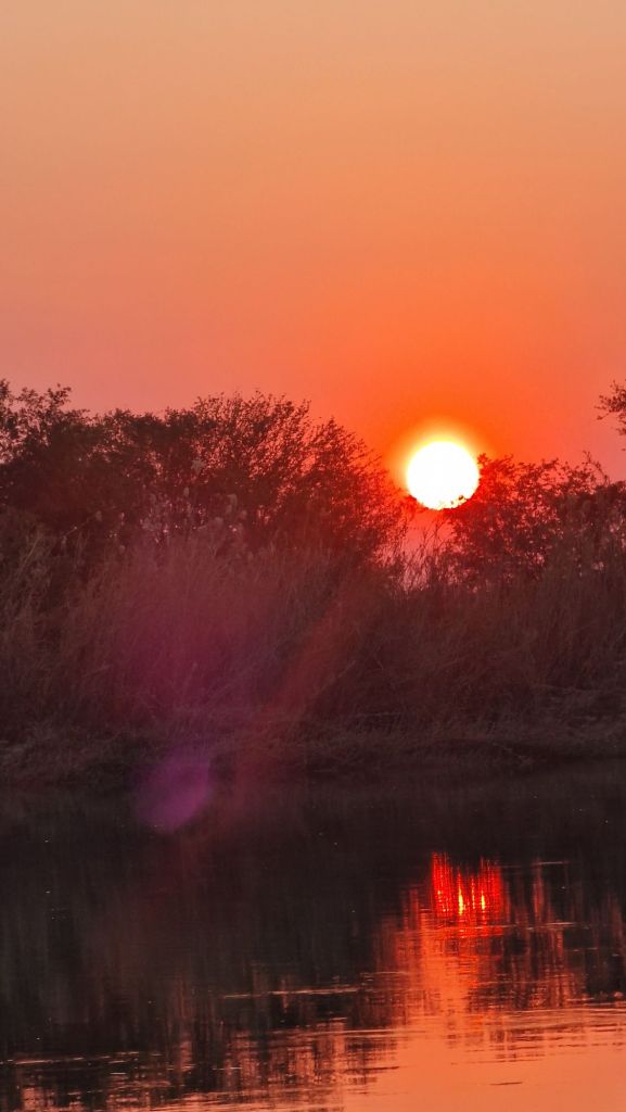 Arrivati al confine con Angola vediamo un coro di donne e bambini pronti a cantare e battere le mani per darci il benvenuto. Simon, il nostro barcaiolo tira fuori un cartello in cartone con la scritta “Illegally in Angola”. C’è un ilarità generale e scatti con il cartello. Collettivamente diamo del denaro al coro e ritorniamo verso il lodge accompagnati da un tramonto mozzafiato con dei colori che sembrano usciti da un dipinto.
