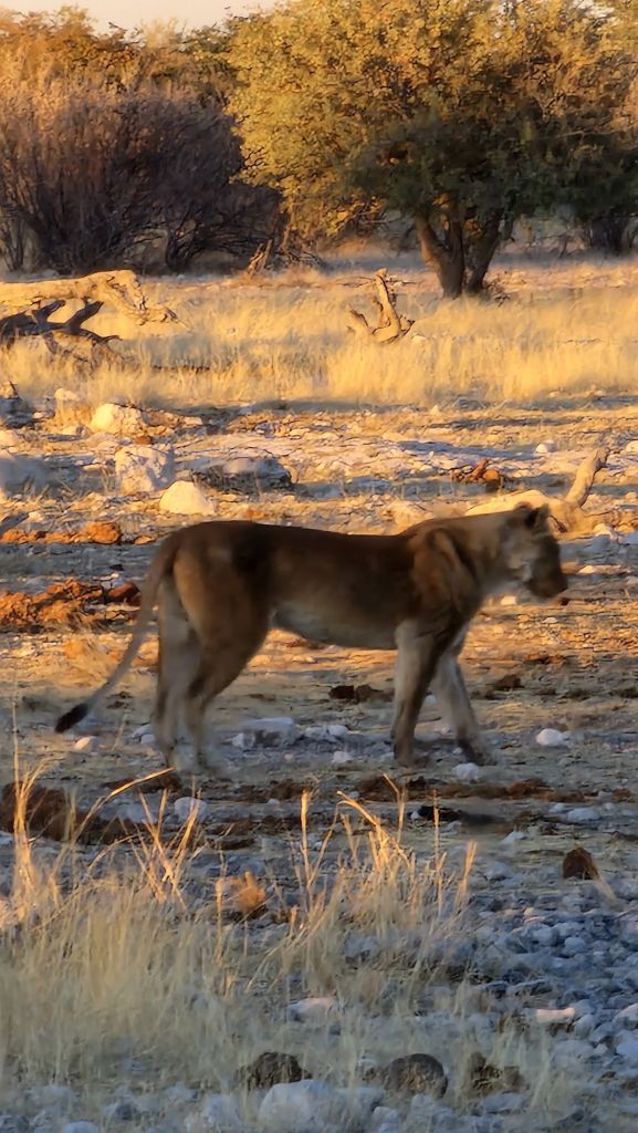 Il secondo giorno di Etosha vediamo la stessa leonessa stanca che beve in un laghetto, una miriade di giraffe far colazione, altri elefanti. In uno dei laghetti vediamo Zebre, giraffe e springbok bere tranquillamente l’acqua mentre non poco lontano sono seduti due Leoni nell’ombra aspettando di attaccare al momento giusto.