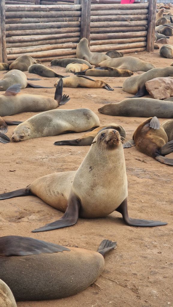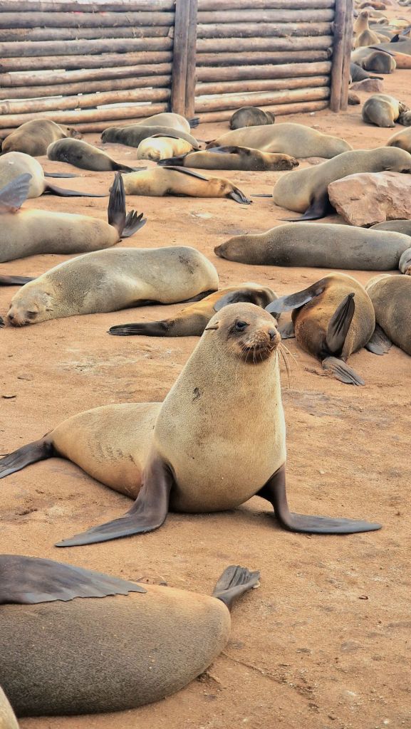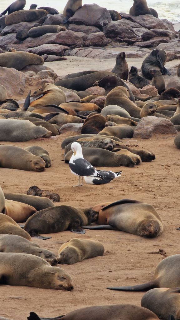 Ci fermiamo per il pranzo con il Truck, un pranzo freddo ma comunque piacevole. Dopodiché ci avviamo per vedere una miriade di foche appoggiate sulla costa di Cape cross. Migliaia e migliaia di foche appoggiate una addosso all’altra, con i piccoli che bevono il latte dalla madre, le foche madri che richiamano i propri piccoli, foche giganti, foche bagnate, foche con la propria coda sul muso di un’altra foca, foche nel mare e soprattutto foche puzzolenti. Emettono un odore nauseabondo nonostante siano costantemente nell’acqua per farsi il bagno. Sono buffe ed emettono suoni veramente strani e assurdi.