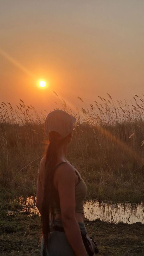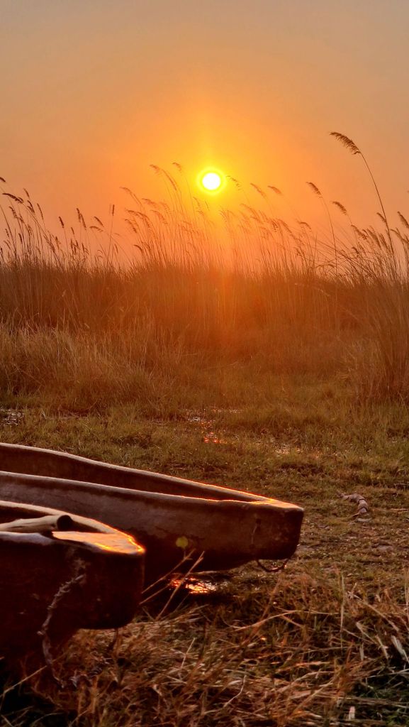 Il gruppo si riunisce alle 5 di sera per ammirare il tramonto sul mokoro, remato dai nostri esperti compagni di viaggio. La crociera sul mokoro è ancora più incantevole al tramonto, quando il fiume limpido riflette i colori del cielo in un gioco di luce e ombre. Le piante acquatiche creano un effetto di nascondino con il sole, che emerge nella sua gloria, inondando la scena di bellezza.